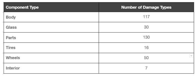 PAVE's inspection engine analyzes images to detect 350 specific damages of different degrees of severity that cover most cosmetic damages on 249 components that make up the anatomy of over 23,000 light commercial and passenger vehicle models sold over the past 15 years in North America that PAVE’s models were developed from.